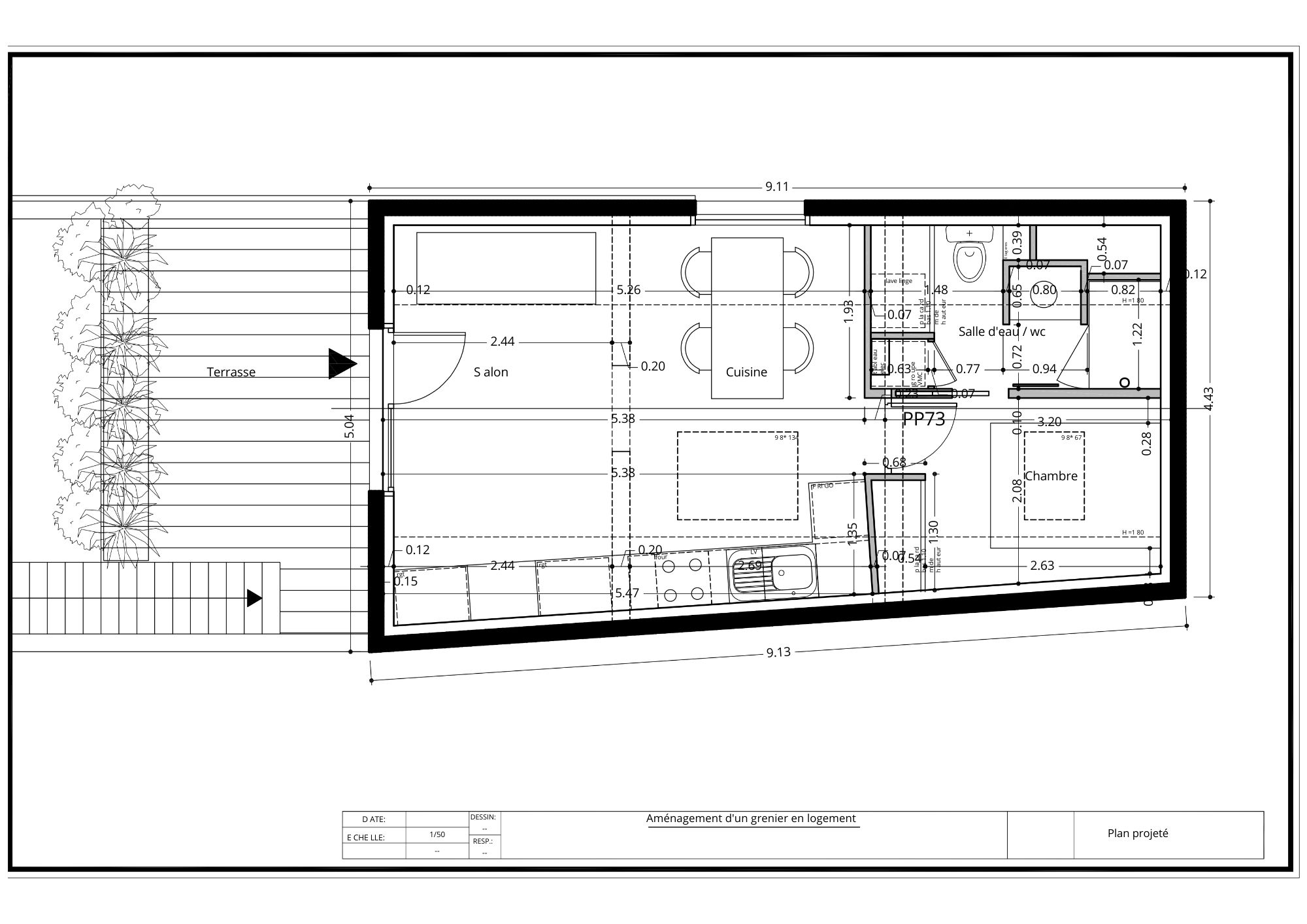 Transformer un grenier, utilisé auparavant pour du stockage de foins, en un cocon douillet sous les toits pour accueillir des voyageurs de passage dans leur région. La surface devra être optimisée dans les moindres détails afin de pouvoir accueillir toutes les fonctions nécessaires : une cuisine fonctionnelle et complète, un espace repas, un espace salon, un espace chambre et une salle d’eau avec un receveur de 120*90.