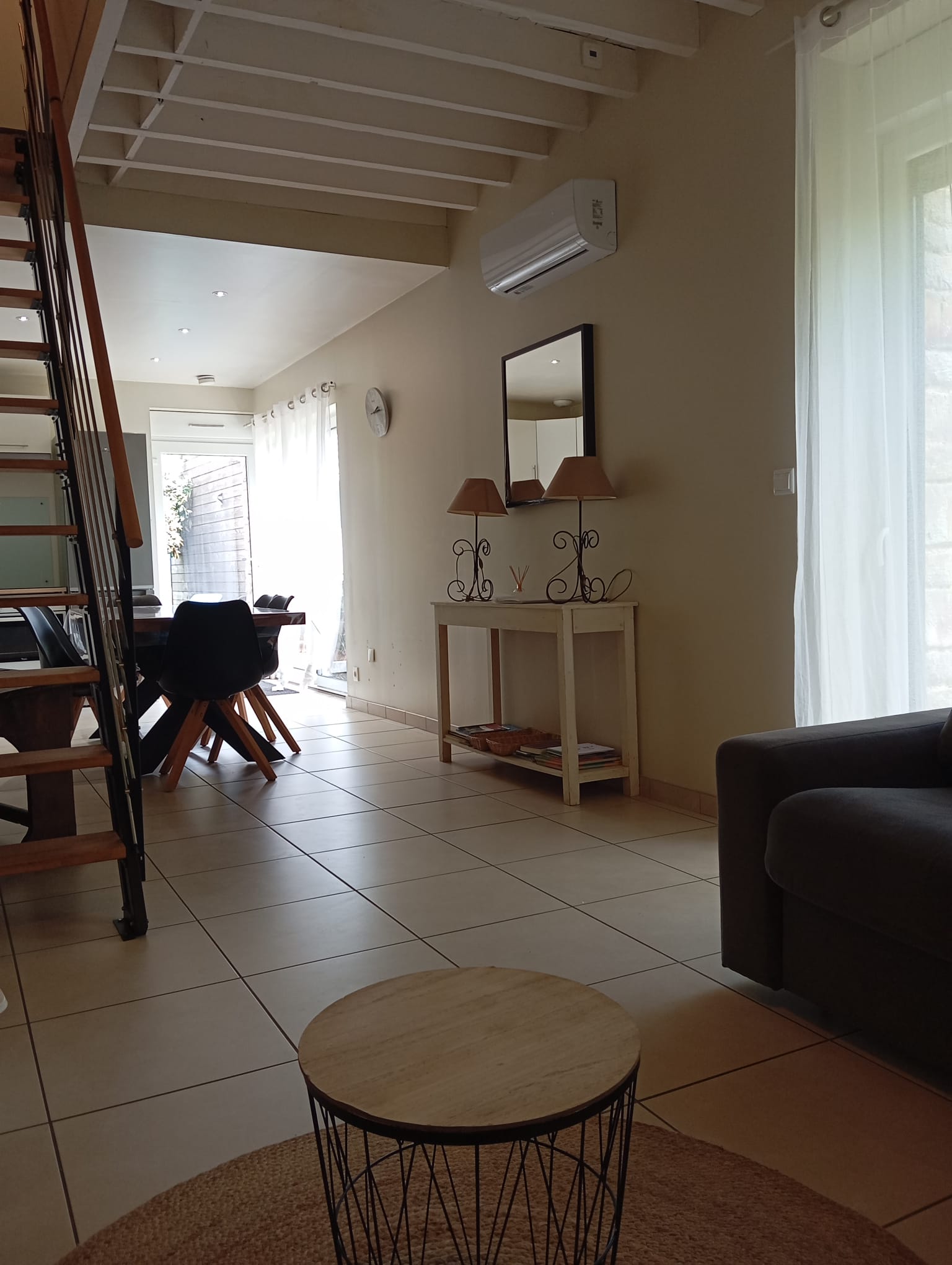 • L’intérieur, la bâtisse étant étroite, il a été privilégié de supprimer le mur qui séparait la grange en deux afin de libérer l’espace pour une pièce de vie spacieuse et lumineuse. L’étage, qui était un grenier, a été aménagé pour accueillir une chambre, une salle d’eau avec WC ainsi qu’un petit local technique pour accueillir la VMC et un peu de rangement. Deux terrasses ont également été créées pour accueillir un espace salon et un espace pour les repas en extérieur.