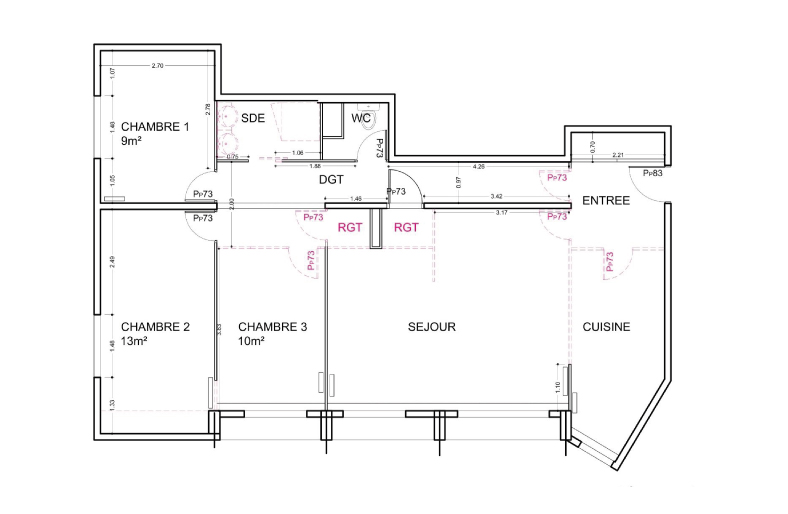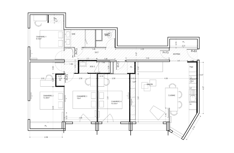 Un mur porteur traversant presque la totalité de l’appartement et des murs de refends béton en guise de cloison entre plusieurs pièces. La contrainte forte a été de s’adapter à cela pour optimiser au mieux les espaces